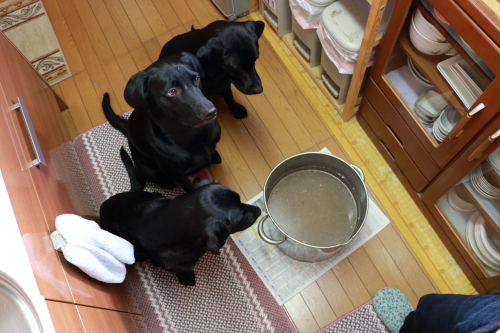 犬がそばから離れません。放っておいたら寸胴をずっと舐めてます笑。
